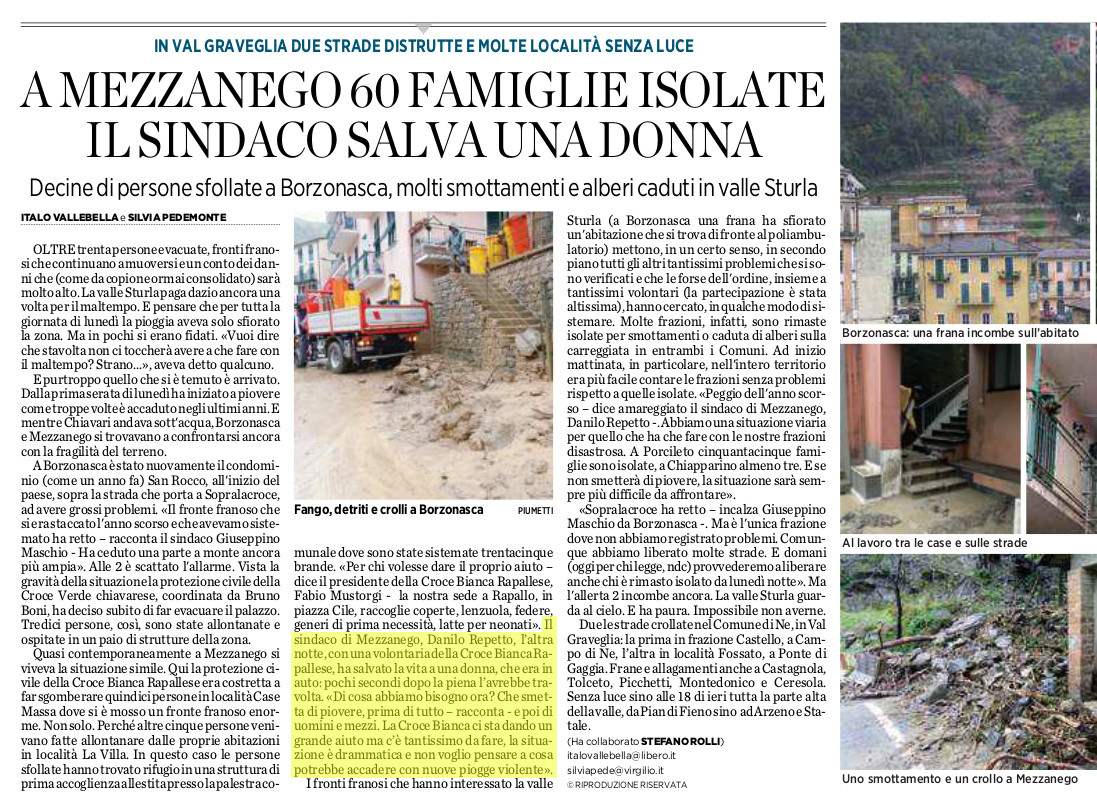 A Mezzanego 60 famiglie isolate, il Sindaco salva una donna